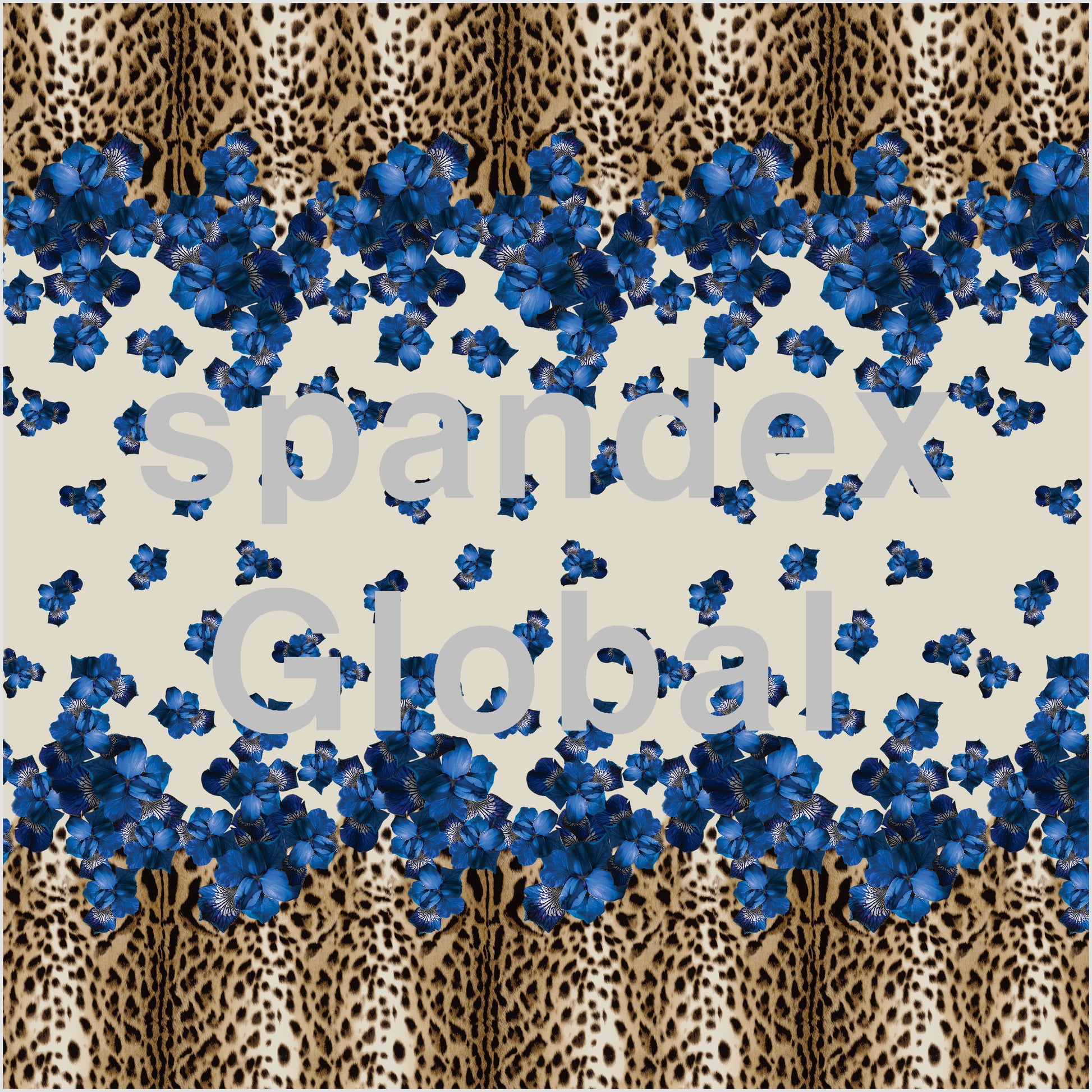 A striking combination of wild and elegant, our Blue Flowers and Leopard Print fabric is a showstopper. The design features a bold leopard print border on the top and bottom, separated by a beige center stripe adorned with lush, beautiful blue flowers. This unique and sophisticated fabric is perfect for creating stylish dresses, tops, or skirts.