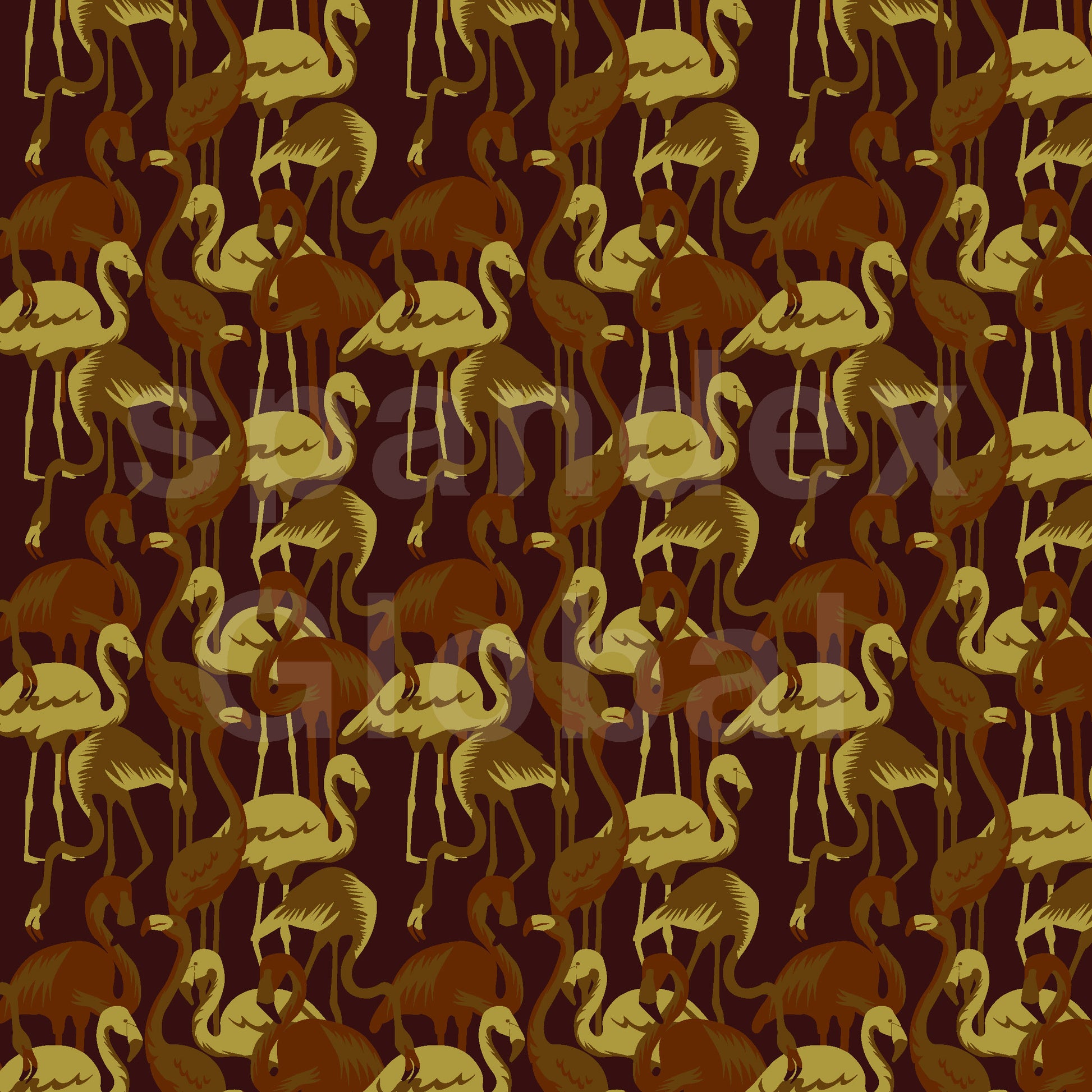 A sophisticated take on a tropical classic, our Brown Flamingo fabric features a dense, repeating pattern of elegant flamingos. The birds are rendered in various shades of brown and gold, creating a rich, earthy palette that stands out against a deep maroon background. This unique and stylish print is perfect for adding a touch of exotic flair to your activewear, swimwear, or everyday fashion.
