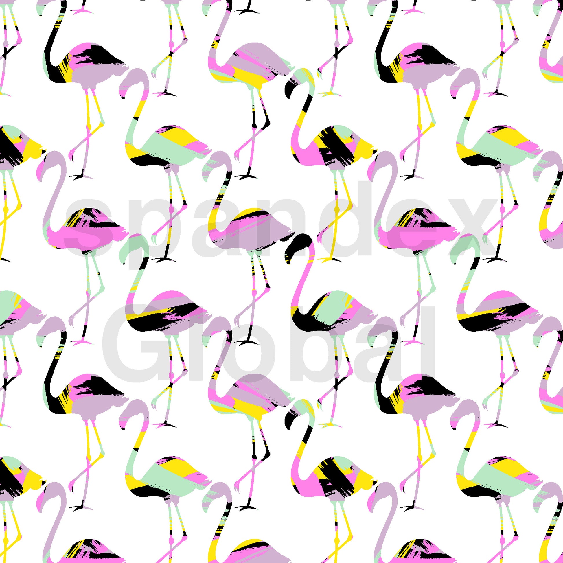 Make a vibrant splash with our Flamingo Pop Art Spandex! This playful pattern features stylized flamingos with a cool, brushstroke texture in a lively palette of pink, black, mint, and yellow, all on a crisp white background. Perfect for energetic swimwear, bold activewear, or any project that demands a fun, artistic, and tropical statement.