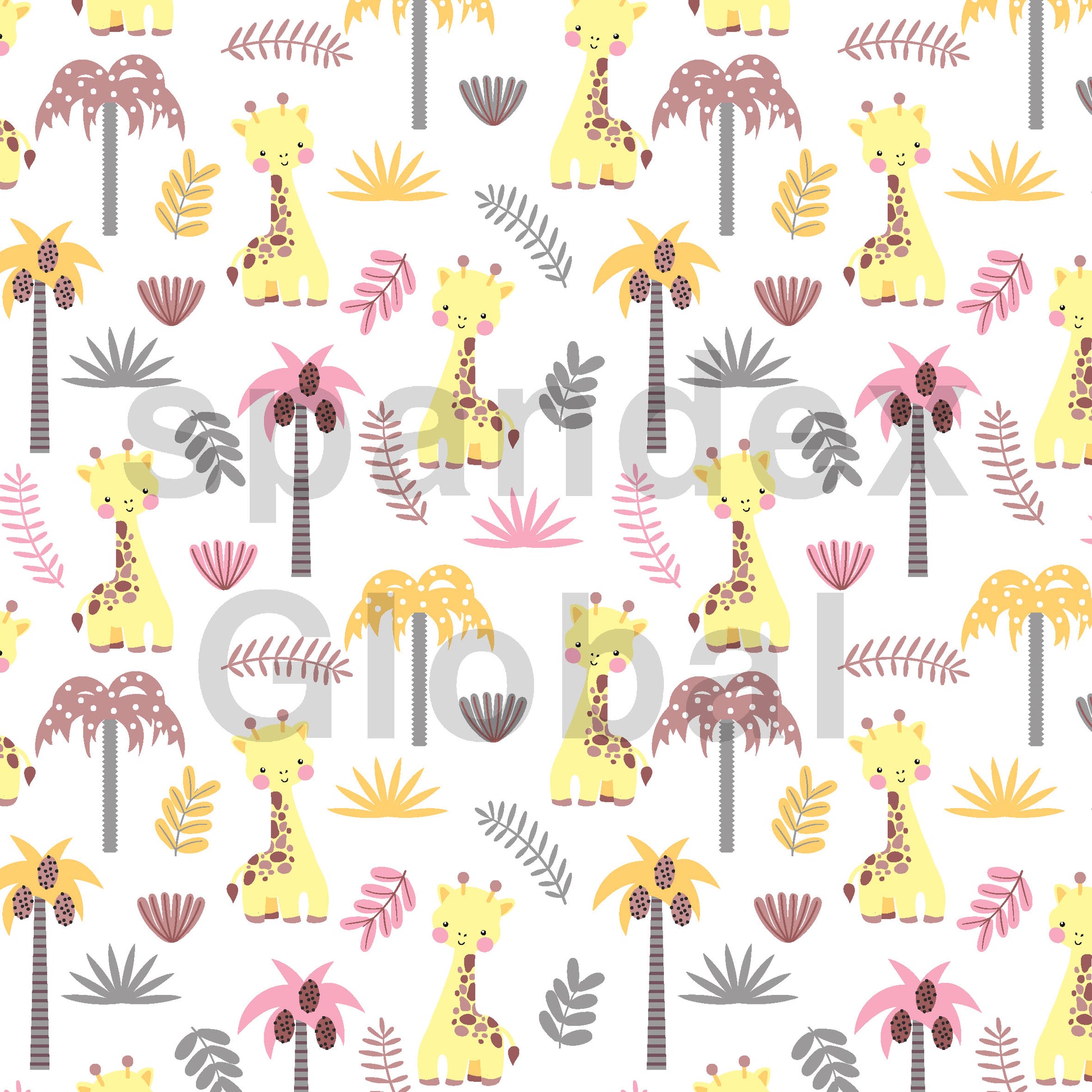 Take a safari with this whimsical Palm Trees and Giraffes fabric. Cute, smiling giraffes with spotted bodies are scattered among stylized palm trees and leaves. The cheerful color palette of yellow, pink, and grey on a clean white background makes this a bright and playful design, great for children's apparel and summer projects.