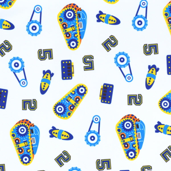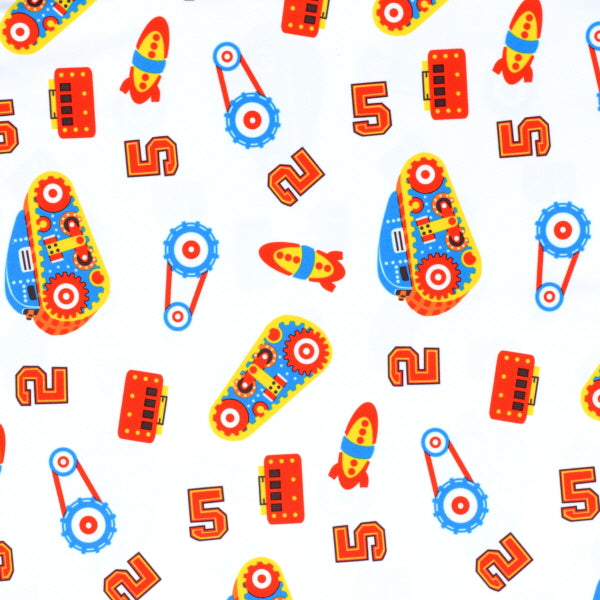 Blast off into your next project with this playful Planetary Rover and Rocket Print! This fun fabric features colorful, stylized designs of rockets, planetary rovers, and numbers. The vibrant primary colors—red, blue, and yellow—pop against the white background. This energetic and exciting print is a fantastic choice for kids' apparel, pajamas, or unique projects for space lovers.