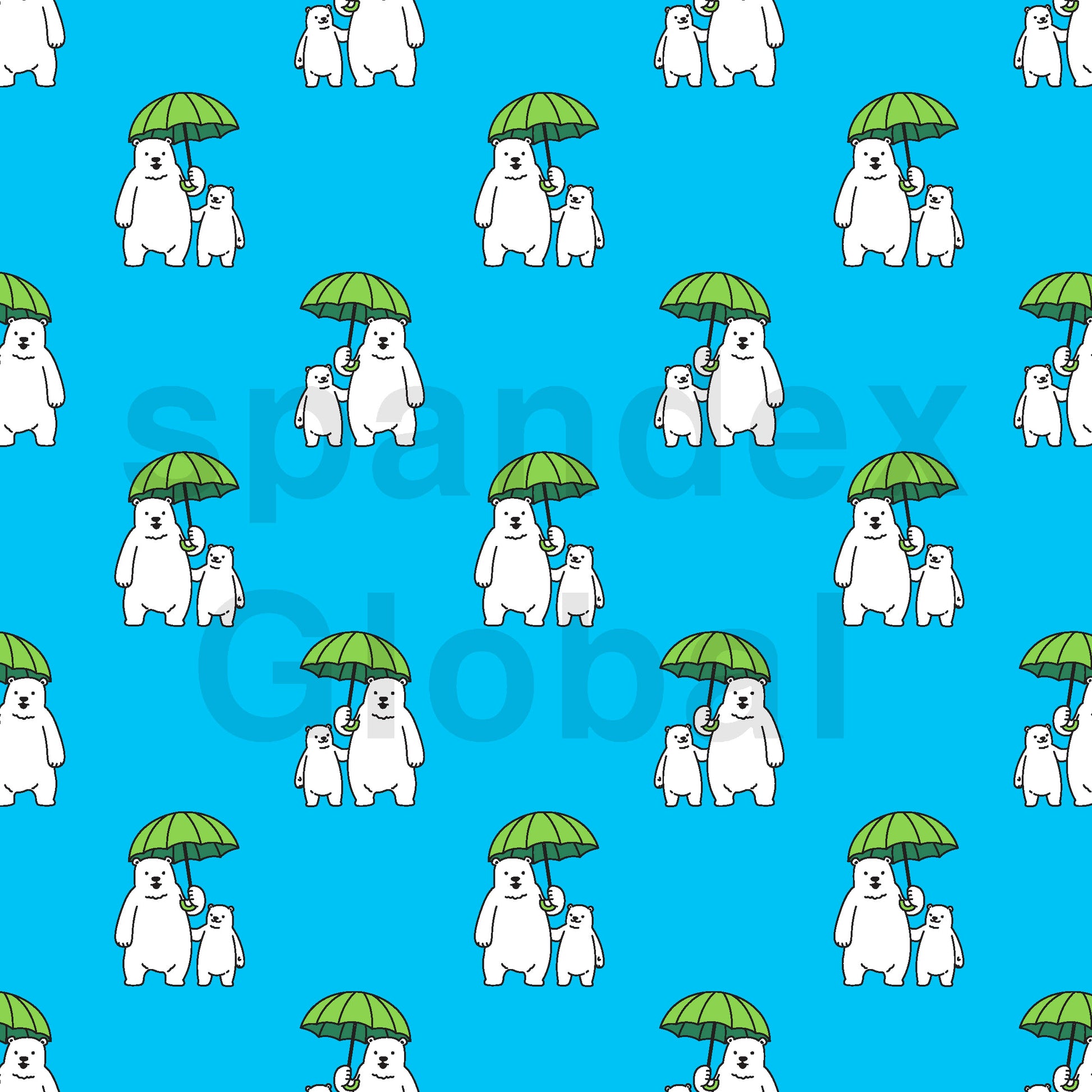 This Polar Bears with Umbrella fabric is as sweet as can be. The pattern features adorable polar bear families—a large bear holding a green umbrella to shelter a smaller bear—all against a vibrant blue background. This cute and heartwarming print is perfect for crafting unique projects for little ones.