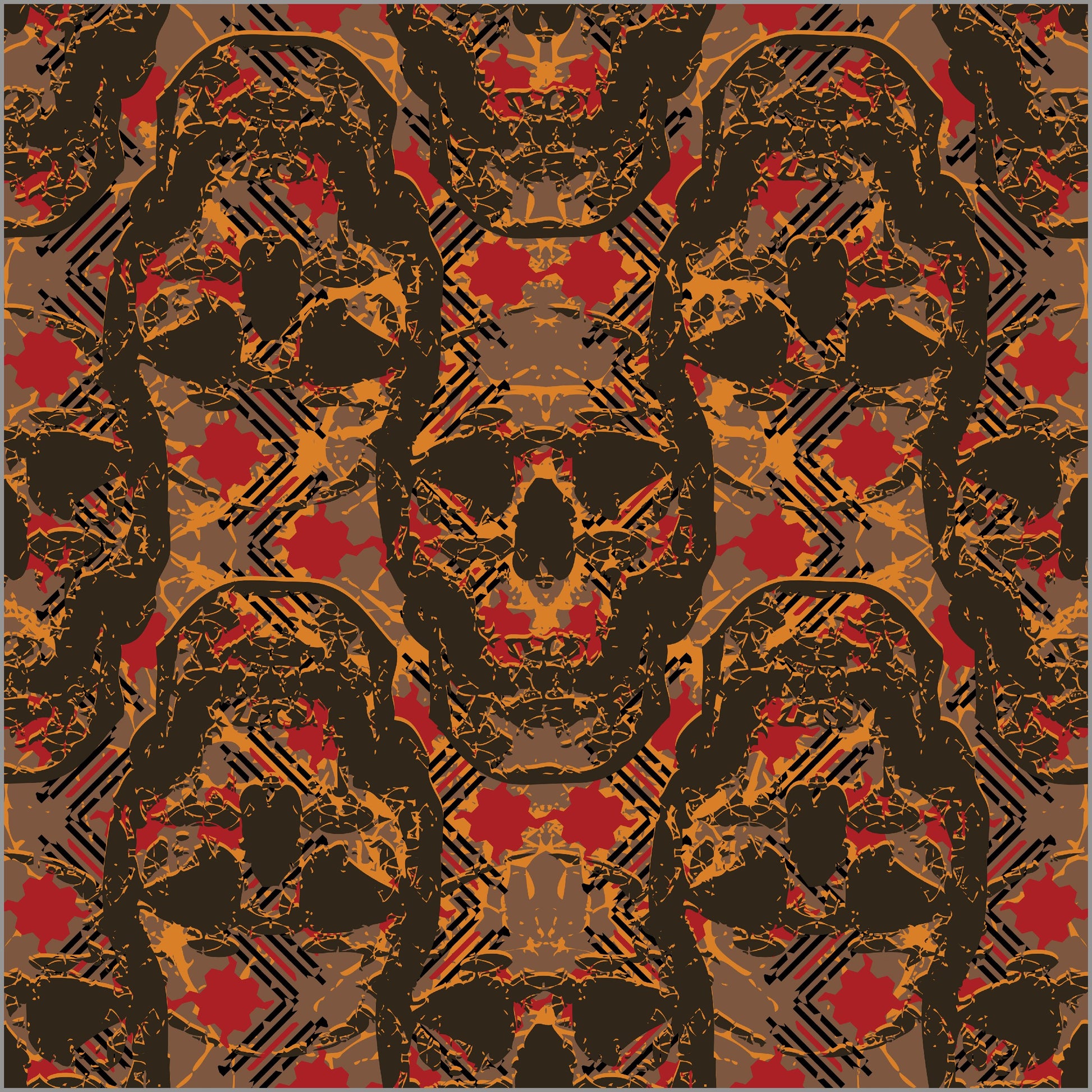 This bold and graphic Scratched Skull Print makes a powerful statement. The fabric features a repeating pattern of stylized skulls with a distressed, scratched texture. The color palette of rich browns, warm orange, and black creates a rugged and edgy look. This unique and intricate design is perfect for creating gothic-inspired fashion, Halloween costumes, or alternative apparel.