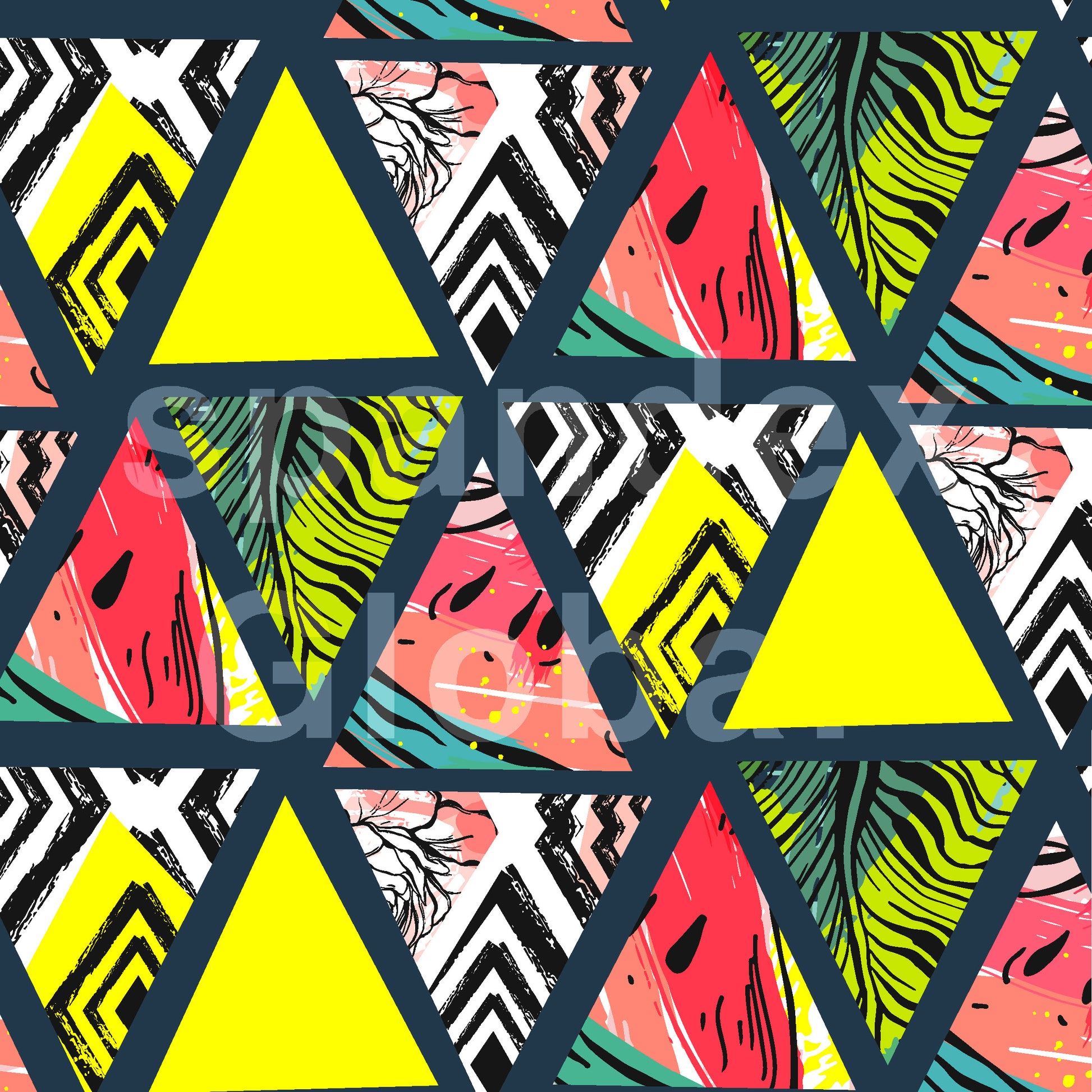 Escape to a vibrant paradise with our Tropical Abstract Print Spandex! This lively pattern features an energetic mix of bold geometric triangles and abstract, watercolor-style tropical elements like watermelon slices and palm fronds, all against a dark blue background. Perfect for swimwear, resort wear, or activewear that brings a fun, artistic, and summery vibe.